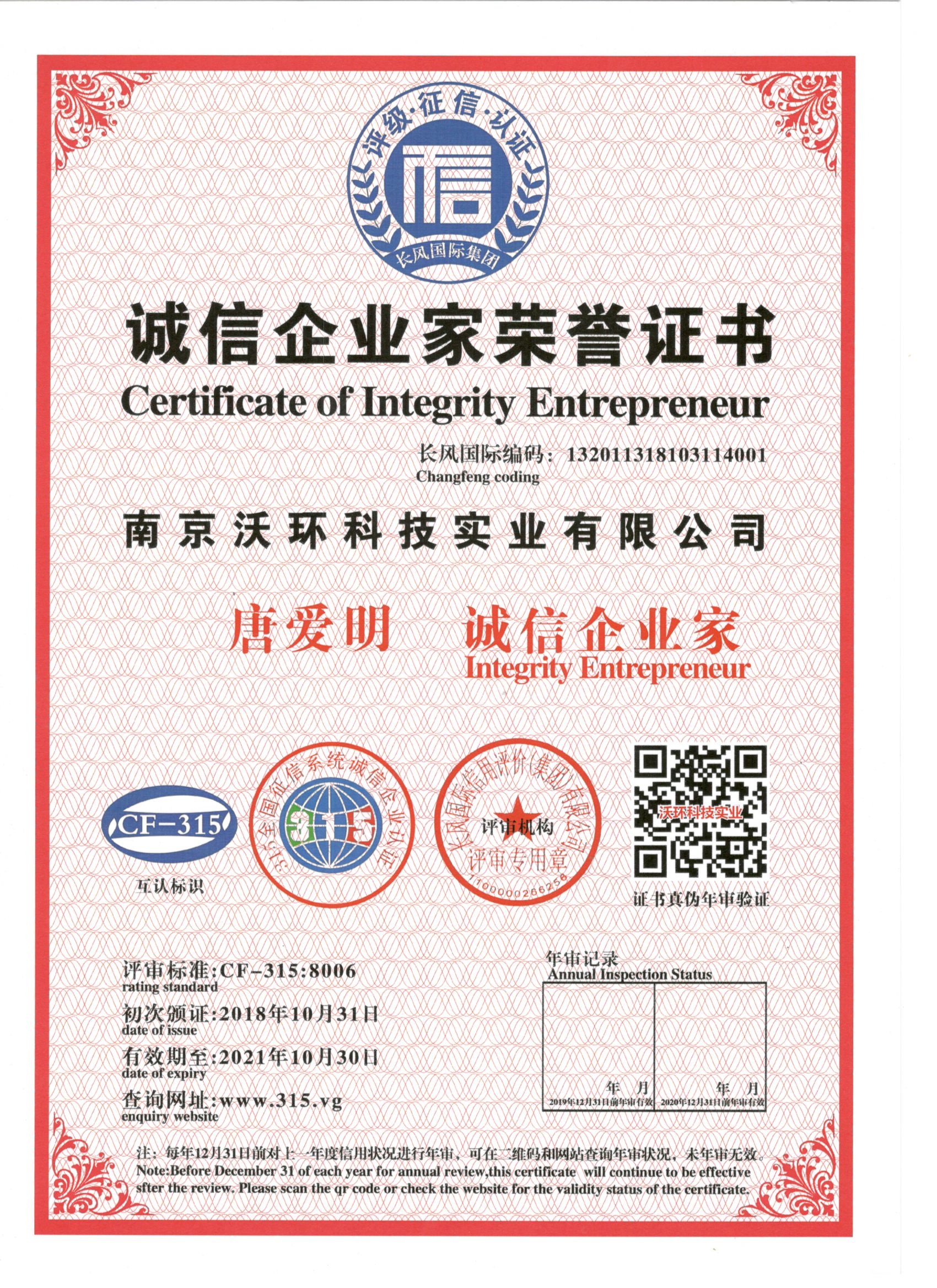 熱烈祝賀南京沃環(huán)公司唐愛明先生被專業(yè)評審機構(gòu)-長風(fēng)國際集團評為誠信企業(yè)家,特發(fā)此證書